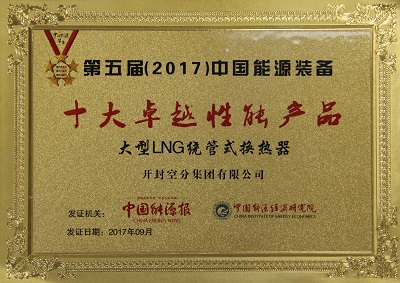 9月20日,由中國(guó)能源報(bào)社、中國(guó)能源經(jīng)濟(jì)研究院共同舉辦的首屆(2017)中國(guó)能源產(chǎn)業(yè)發(fā)展年會(huì)在北京召開(kāi)。國(guó)家能源局總監(jiān)李冶出席會(huì)議并致辭。會(huì)議對(duì)第五屆中國(guó)能源裝備十大卓越性能產(chǎn)品進(jìn)行了頒獎(jiǎng),開(kāi)封空分大型LNG繞管式換熱器獲此殊榮。